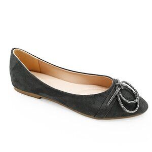 Chic dark grey suede-style ballerina flats featuring a sparkling rhinestone bow accent on the front. Designed for comfort with a flat sole, perfect for office wear, casual outings, or everyday elegance. Soft finish and lightweight design make them easy to wear all day. New condition.