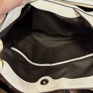 Color: Chalk white leather and Khaki or Tan jacquard signature fabric. Brown interior fabric lining.