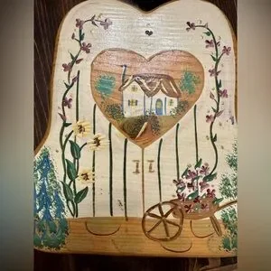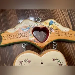 Charming wooden sign with 'Welcome Friends' message. Features a heart-shaped cutout and painted floral and house design. Perfect for home decor.