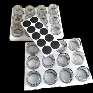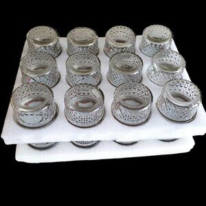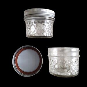 Quilted cut glass 4oz jars clear with silver tone bands and lids for canning, preservation and storage. Offer reliable sealing and elegant presentation for homemade goods such as jams, honey, spices, shower and wedding favors, crafts, DIY. Includes set of round black "chalkboard" adhesive labels.