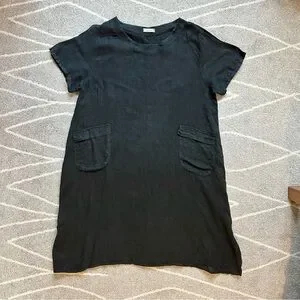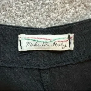 Really pretty, classic black Italian linen dress. It’s a casual midi dress that can be worn out and about or even as a beach coverup. It’s definitely been washed, worn and loved into a super soft piece. While it has no stains or holes, it shows normal signs of wash, wear and love. It has no size tag, but based on measurements and what I know of the previous owner, this is an oversized 2X. 26” pit to pit, 44.5” length.