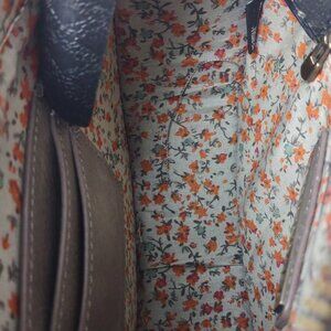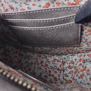 Structured silhouette with zip top closure. Interior includes one slip pocket and one card pocket.