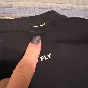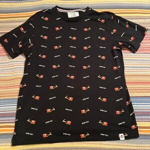Free Planet graphic t-shirt in black with an all-over print featuring Santa Claus in a sleigh with reindeer and the text "STAY FLY". The shirt has a crew neck and short sleeves. A small stain is visible on the front of the shirt and a small mark on the collar.