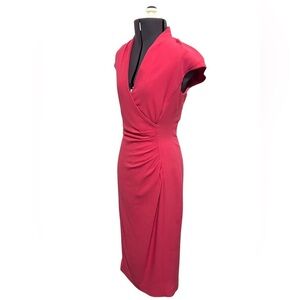 Dress in style with this beautiful DR MARLENE dress in 'Jelly Bean', which is a coral pink. Nicely tailored, with flattering ruching on the front, and a crossover neckline. Fully lined. Suitable for special occasions or for business.