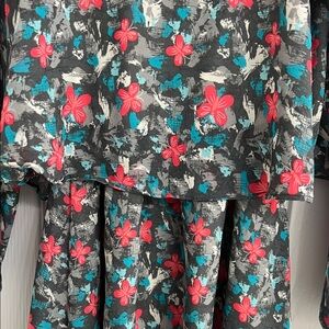 Adorable Nanette Kids girls’ dress in size 10/12 featuring a beautiful floral print in shades of red, teal, and gray. Designed with a flowy fit, long sleeves, and a bright pink crochet lace neckline for a pop of color. Perfect for special occasions, school events, or everyday wear with leggings or boots!