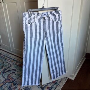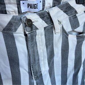 PAIGE Nellie Culotte High-Rise Wide-Leg Jeans, Vertical Stripe gray/White, Size 29 — Made in USA. These stylish culottes feature a bold vertical stripe pattern in a classic gray and white colorway. The high-rise waist and wide-leg silhouette offer a modern, flattering fit.