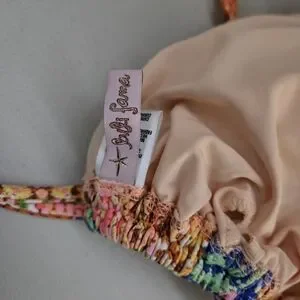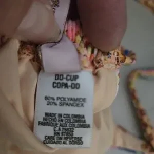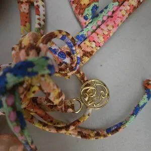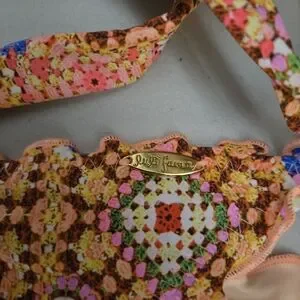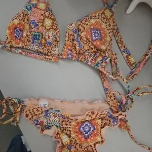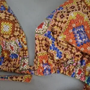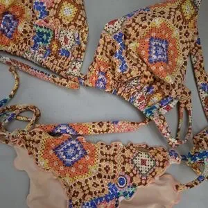 Eye-catching bikini set with mosaic patterns. Features a blend of orange, blue, and pink hues.