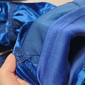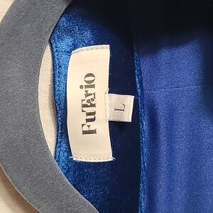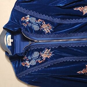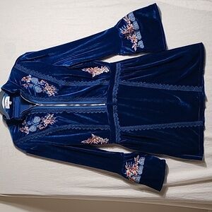 FuTario Boho Blue Velvet Zipper Front Embroidered Lace Trimmed Mini Dress Large