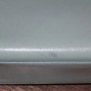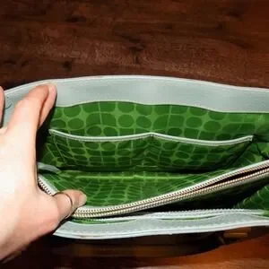 Kate Spade New York satchel crafted from pebbled leather in a refreshing mint green hue. This structured handbag features a triple compartment interior with a center zip divider, lined in a vibrant green spade-patterned fabric. Gold-tone hardware accents the exterior, including the signature spade logo and protective base feet. Dual rolled top handles provide a comfortable carry for this versatile everyday accessory. This item is in good pre-owned condition with some minor marks on the bottom and light wear consistent with use.
