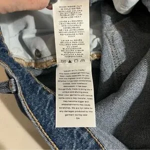 Features: button and zipper closure, high waisted, split level hems, frayed hem, some stretch, distressing, inspired by 90’s style, denim, cut off