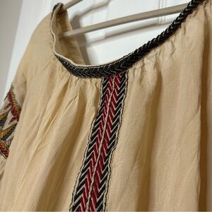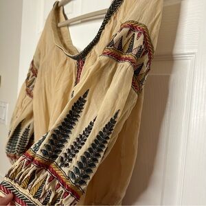 Bohemian off-the-shoulder bodysuit featuring a lightweight, semi-sheer fabrication. Beautiful nature-inspired embroidery throughout. Elastic at the neckline and sleeve cuffs for a simple fit. Snap button and hook-and-eye closures at the gusset.