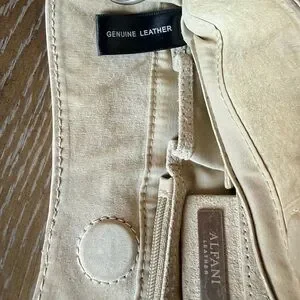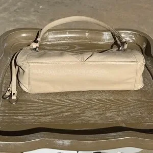 Alfani Leather Shoulder Bag. Designed with classy pleats in Beige/Cream/Tan. Two interior zippers pockets with one more inside pocket. Magnetic Closure. This is a beautiful gently used bag, it is not new, please see pictures for interior markings.