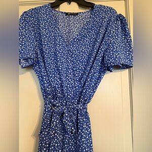 Beautiful PrettyGarden blue floral midi dress in size Large. Features a flattering V-neckline, short sleeves, and adjustable tie waist for a feminine, cinched silhouette. The flowy skirt with subtle ruffle hem adds movement and makes it perfect for spring and summer.