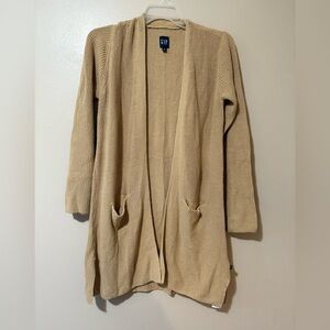 Stylish tan knit cardigan from GAP. Ideal for casual wear. NWT, retail is $80. Women’s size medium. 2 front pockets. Perfect for fall! Pet and smoke free home.