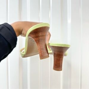 2000s vintage y2k slip-on sandals in a fresh pistachio green hue. Features a playful multi strap design with delicate knot with silver-tone ring hardware, and the most perfect wood-grain flared kitten heel. Made in Brazil