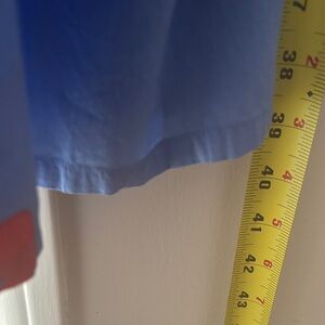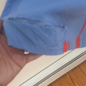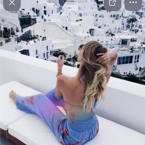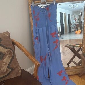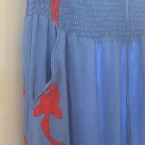 Beautiful light blue jumpsuit with pockets featuring striking orange patterns. Ideal for stylish outings or as a beach coverup. I did rip the bottom right leg 💔 maybe you are good at sewing (I’m not) or they can be hemmed as they are very long last picture is me wearing it I am 5’7” and on my tippy toes small stain on front just above pocket probably just needs to be spot treated price will reflect.make me an offer