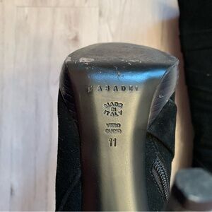 Made in Italy, these black suede Casadei boots feature sleek silver hardware, offering a chic, sophisticated look. Perfect for both day-to-day wear and evening outings, these high-quality boots are in excellent pre-owned condition and add a touch of luxury to any outfit. Size 11 5” heel