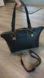 Chic black tote by Michael Kors. Features gold-tone hardware. Exterior charm missing. Height 12". Base 14". Width Approx 5 1/2". Long strap is removable and adjustable.