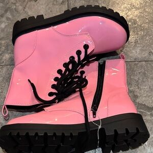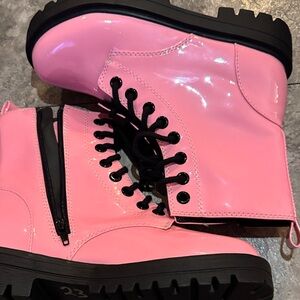 Bold pink combat boots with sturdy black soles. Features lace-up design and side zipper for easy wear.
