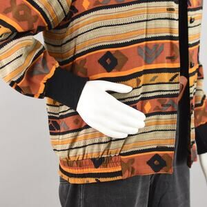 Vintage lightweight bomber style jacket. Colors range from black, orange and brown. Southwestern inspired print all over. Soft black band collar, matching wrist cuffs and waistband, Thin shoulder padding. Small rounded glossy plastic buttons down the front. Made from a soft rayon fabric and the inside is lined in silky black fabric.
