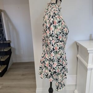 • Style: Pullover, Smocked ruffle mock neck, smocked front and back w/ ruffled bottom, relaxed loose fitting arms w/ smocked cuffs that ruffle out at bottoms, floral print