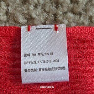 The tag is entirely in Chinese, but I used Google Translate to determine that this scarf is exactly what it feels like--a cashmere silk blend (80/20). Flawless condition with zero signs of wear. No pet hair, no odor. Lightweight with a soft silky hand and a lovely drape. Color is a coral red.