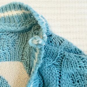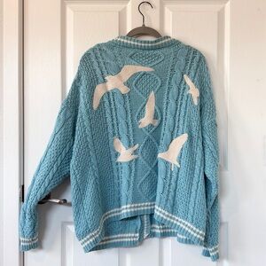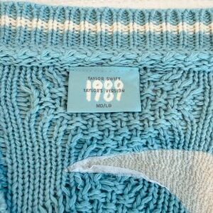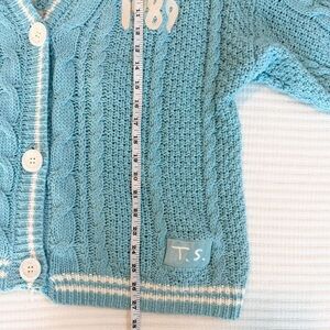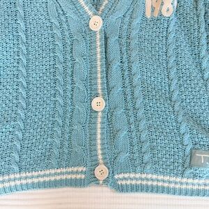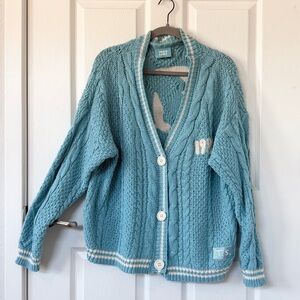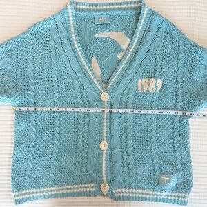 Light blue three button cable knit cardigan with cream stripes featuring "1989" embroidered on left chest with "T.S." patch sewn on wearer's left hem and seagull design embroidered on back. Acrylic blend.