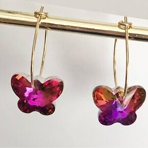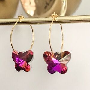 New Handmade Sparkling Dangling Crystal Butterfly Hoop Earrings Magenta Pink