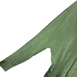 DETAIL: V-NECK. DOLMAN LONG SLEEVES WITH BUTTON CUFFS. UNLINED. NOTCH AT FRONT. MERMAID LIKE SHEEN
