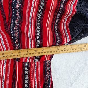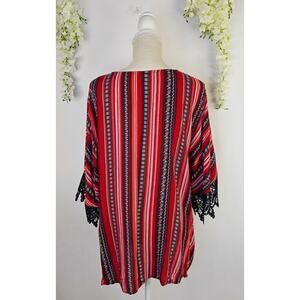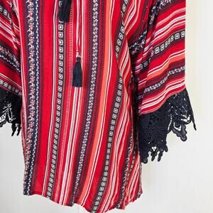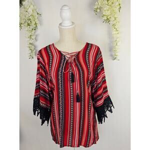 Cato Patriotic Blouse XL Red Striped Tassel Tie Lace Bell Sleeve Americana Boho