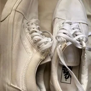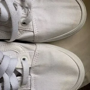 Stylish classic white Vans canvas sneakers with lace-up design. Perfect for casual wear. Need to be bleached and cleaned! Only worn a few times - there’s a lot of life left to them but there is wear as shown.