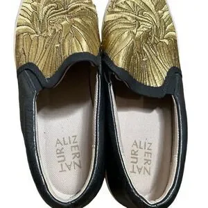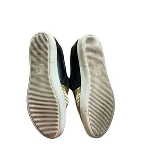 Super comfortable slip ons in gorgeous gold and black