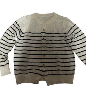 Classic cream cardigan with black horizontal stripes and front button closure. Soft knit, timeless preppy style—perfect for layering year-round.