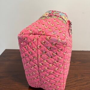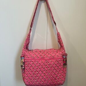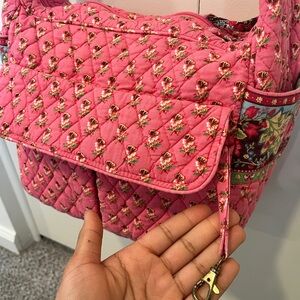 This stylish pink quilted shoulder bag features two front velcro pockets, back zip pocket, two side pockets and 4 inside pockets.