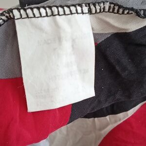 Chic off-shoulder blouse with abstract patterns. Features bold red and black hues. Perfect for a stylish look.