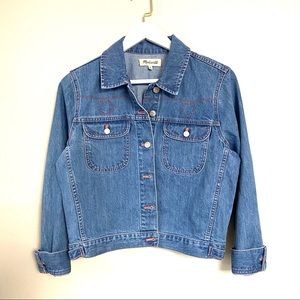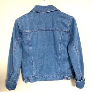 Classic denim jacket. Button-front closure. Two chest pockets. Sweet pink threading.