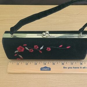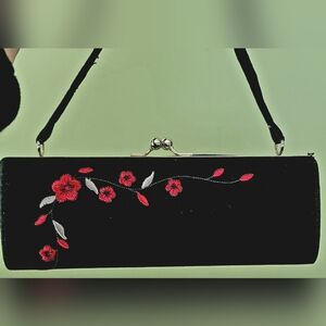 This elegant black clutch features beautiful red floral embroidery, perfect for adding a touch of sophistication to any outfit. Ideal for evening events or special occasions. Beautiful condition, sits upright, measures approx 8.5x3