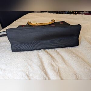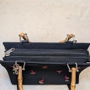 Elevate your vacation edit with this intentional vintage-inspired top handle bag. A perfect blend of Eclectic Grandpa quirk and CabanaCore luxury, this piece features vibrant pink flamingo embroidery on a crisp black canvas. The genuine bamboo handles provide a tactile, earthy touch that aligns with 2026’s shift toward natural fibers and structured silhouettes. Whether styled for a tiki bar sunset or a resortcore brunch, this bag is a nostalgic power piece for the modern pinup. Includes a detachable strap for versatile styling..