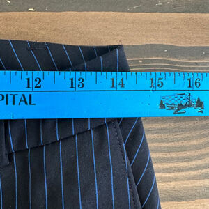 These pre-owned White House Black Market "The Slim Ankle" pants, size 4, feature a classic black fabric with subtle blue pinstripes, offering a sleek and modern look ideal for work or elevated casual wear.