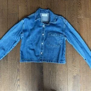 Stylish denim blue jean jacket perfect for casual outings. Features a classic design with a front pocket for added style.