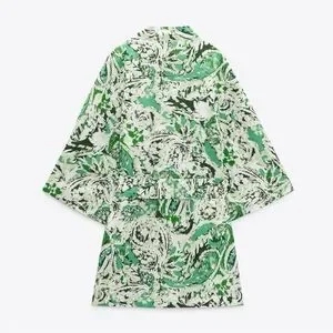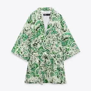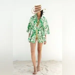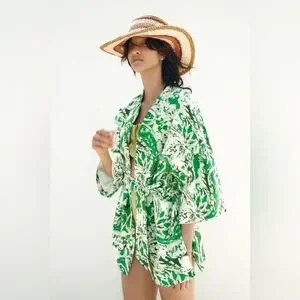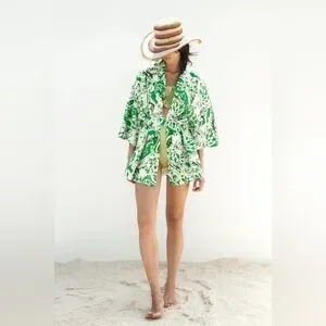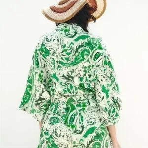 ZARA Linen Blend Printed Kimono Printed ✨ White + Green Size M/L
