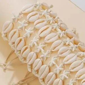 Cute boho shell bracelet featuring starfish accents. Perfect for beach vibes. Waxed white cotton adjustable twine, clear coated shells.