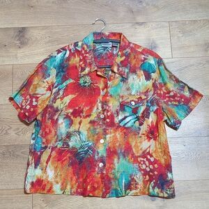 Chico's Bright Print Soft Linen Button Up Short Sleeves Boxy Cropped Shirt Sz 2/M