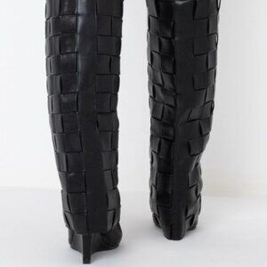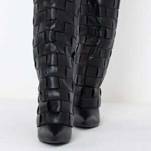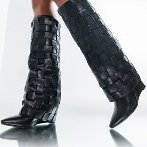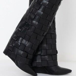 The AZALEA WANG Weaving Through The Night Wedge Boot in Black features a woven faux leather upper, below the knee shaft, chunky wedge heel, pointed toe, and slip on fit.
