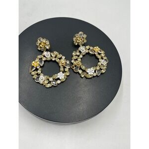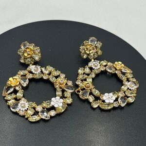 J. Crew Floral Hoop Circles White Enamel Gold Tone Crystal Stud Dangle Earrings