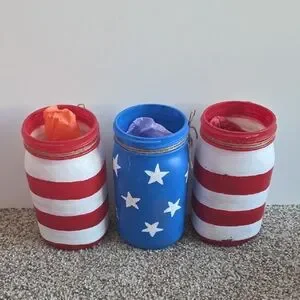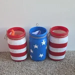 Set of decorative Mason jars in red, white, and blue. Includes twine accents. Perfect for festive decor.