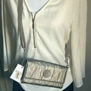 New Kipling Zuma Metallic Pewter Croc Embossed Crossbody Travel Organizer