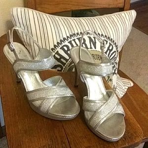 Gently loved 4" ankle strap heels. Only worn once to wedding. Hard to capture the beautiful sparkle they cast. Perfect for special occasion & surprisingly comfortable.