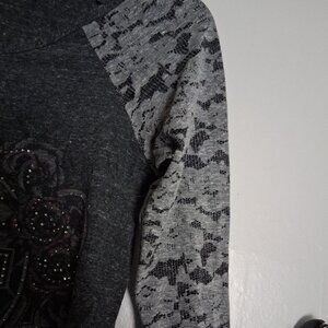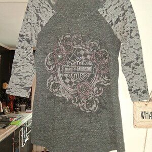 This Genuine Harley-Davidson Ladies 3/4 Length Sleeve T-Shirt in size S features a black and gray color with rhinestone lace sleeve accents, perfect for a casual, motorcycle-themed look. Made from a comfortable cotton blend jersey fabric, this pullover shirt with a round neckline and 3/4 sleeves is machine washable and suitable for wearing during the summer, fall, and spring seasons. The Harley-Davidson brand adds a touch of authenticity to this basic yet stylish women's clothing item.