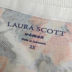 NWT Women's Size 2X cotton Spandex knit blend blue coral white pink floral short sleeve Basic Polo from Laura Scott. 1/4 button up, 29" back length from shoulder and 27" pit to pit. tennis biking golf pickleball beach boating vacation cruise work church travel camping leisure picnic full figure stylish comfort